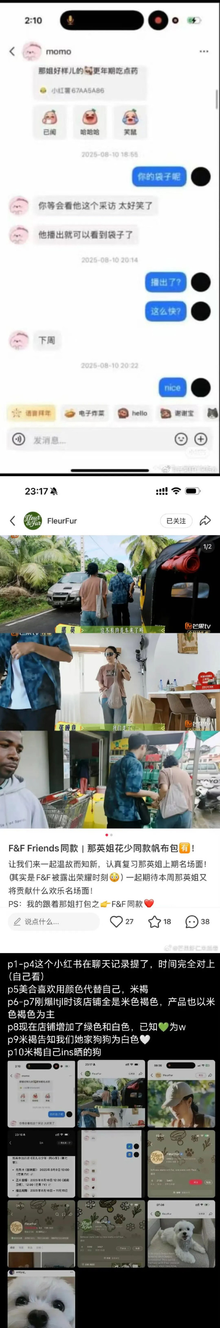 其实这个潮牌的瓜早就有迹可循,此前王一博被裸露的聊天纪录里,王一博和綦好意思合就提到过这个品牌,创立的时分线所有能对上。该潮牌的配景图“骨头元素”,发出来的宠物狗相片皆和綦好意思合早期的酬酢动态对上了,綦好意思合心爱用“米褐”代称我方,该账号主推的居品皆是米色、褐色元素;这个账号发过《花少》的品牌包预报,自后那英真实在节目中背了同款包。