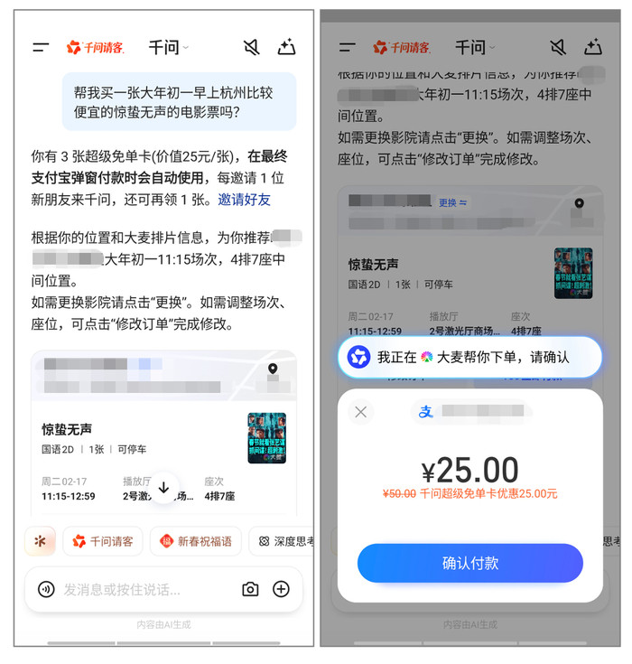 有了AI之后,千问APP将所有经过皆压缩成一句话,“千问帮我买两张明晚八点《惊蛰无声》的电影票,要中间靠后少许的位置。”说完这句话,剩下的一起由AI完成。它能把柄你的定位,完成从保举影院、锁定座位到支付出票的全经过。