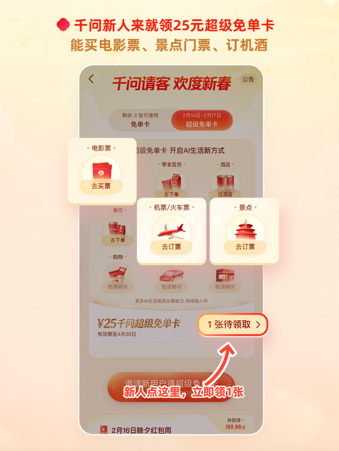 2月14日晚,千问晓谕春节宴客步履再加3天。除了此前覆盖的奶茶、外卖、百货年货,目下新用户灵通千问App,领取超等免单卡,买电影票、景点门票、机票、旅馆,通通直减25元。