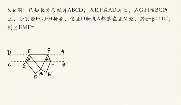 题目:已知长方形纸片 ABCD,点 E、F 在 AD 边上,点 G、H 在 BC 边上,分离沿 EG、FH 折叠,使点 D 和点 A 王人落在点 M 处,若 α+β=110°,则∠EMF=?