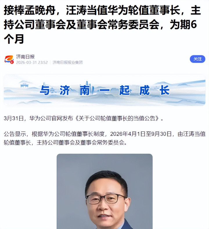 2026年,华为轮值董事长完成换届叮嘱,汪涛肃穆接棒。