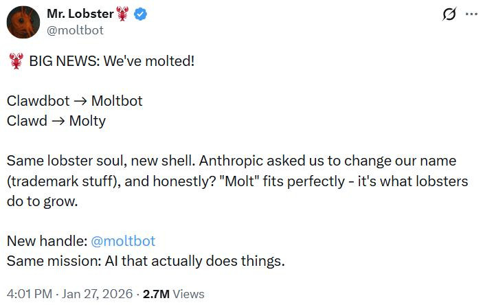 昨天下午,Clawdbot 已正式宣布更名为 Moltbot。
