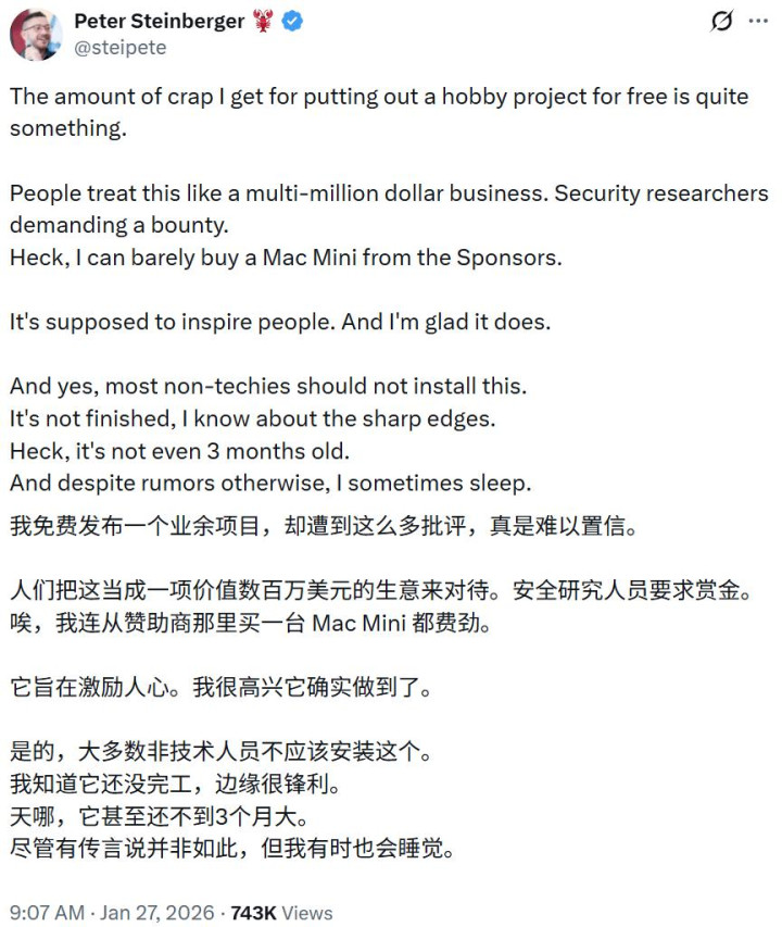 Peter 吐槽称,虽然 Moltbot 极其火爆,但他从赞助商那里获得的资金甚至还买不起一台 Mac Mini。然而,却有安全研究人员将其视为估值数百万美元的商业项目,英雄联盟比赛投注并跑来索要安全赏金。为此,他不得不公开提醒:「大多数非技术人员不应该安装这个」,因为项目尚处于早期阶段,且存在安全风险。