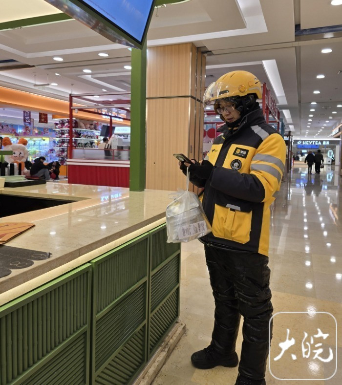丁流平每天的工作时间从下午五点多钟开始,一直忙碌到第二天凌晨。记者见到他时,这个班他已跑了晚餐高峰期的两个多小时,完成了20多单。刚到国购广场,他就接到了一单,将一杯饮料送到附近不远处的另一家商场。大皖新闻记者骑着电动车跟着丁流平开始送第一单,戴着安全帽、穿着羽绒服、戴上手套……虽然当天夜里宣城市区的最低气温并未到零下,但冬夜里的寒意依然随风袭来。