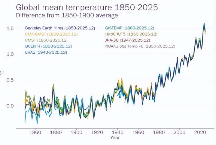 2015-2025年,为有记录(从1850年驱动)以来最热的11年;2025年,是有记录以来第二热或第三热年份,比1850-1900年的平均水平约越过1.43°C。
