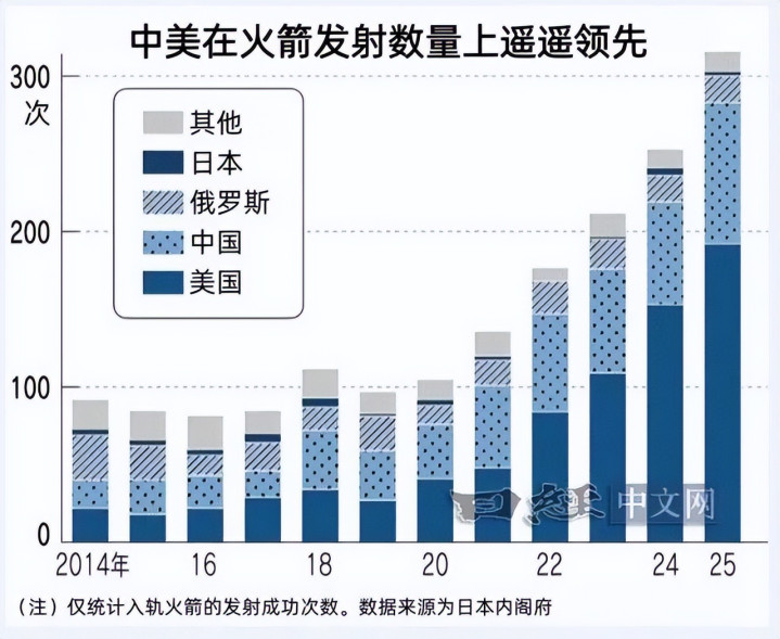 2025年,放射火箭最多的国度是好意思国,悉数192颗;第二位是东大,悉数91颗。比拟2017年,加多5倍以上,这两大占世界放射总量的9成。