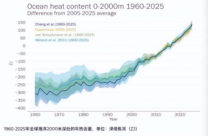可是,当今深海也变热了。2025年,海洋热含量(深度为2000米)达到了自1960年驱动记录以来的最高水平,高出了2024年创下的最高值。
