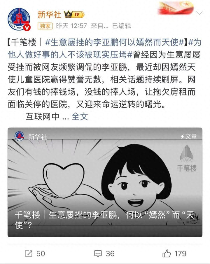 1月26日,新华社发文评李亚鹏——《生意屡挫的李亚鹏,何以“嫣然”而“天使”》。