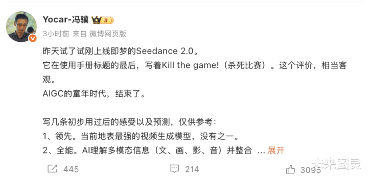 《黑别传:悟空》制作主说念主冯骥说“AIGC的童年期间收尾了”。但童年收尾之后,是芳华期如故中年危急,取决于咱们怎样回报那些尚未回报的问题。冯骥还给这款模子下了判语:“刻下地表最强的视频生成模子,莫得之一。我很幸运,至少今天的Seedance 2.0,来自中国。”