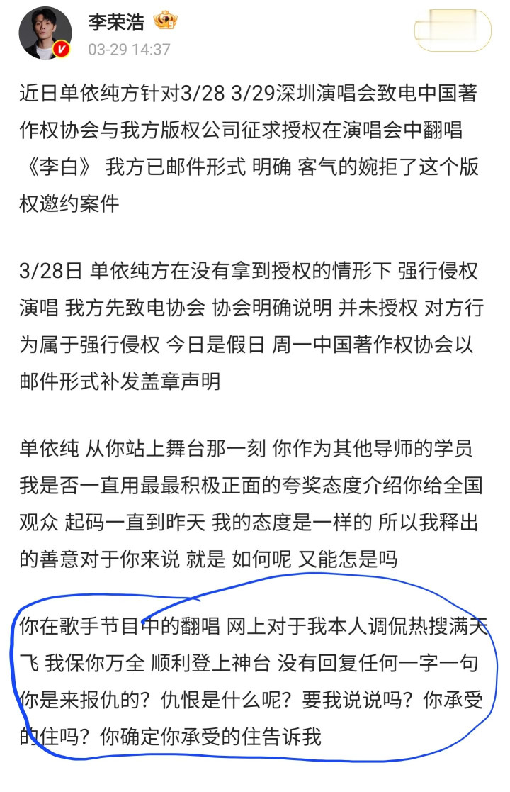lol投注app 李荣浩点名嘲讽女星单依纯, 责问女方强行侵权, 字里行间尽是讥笑