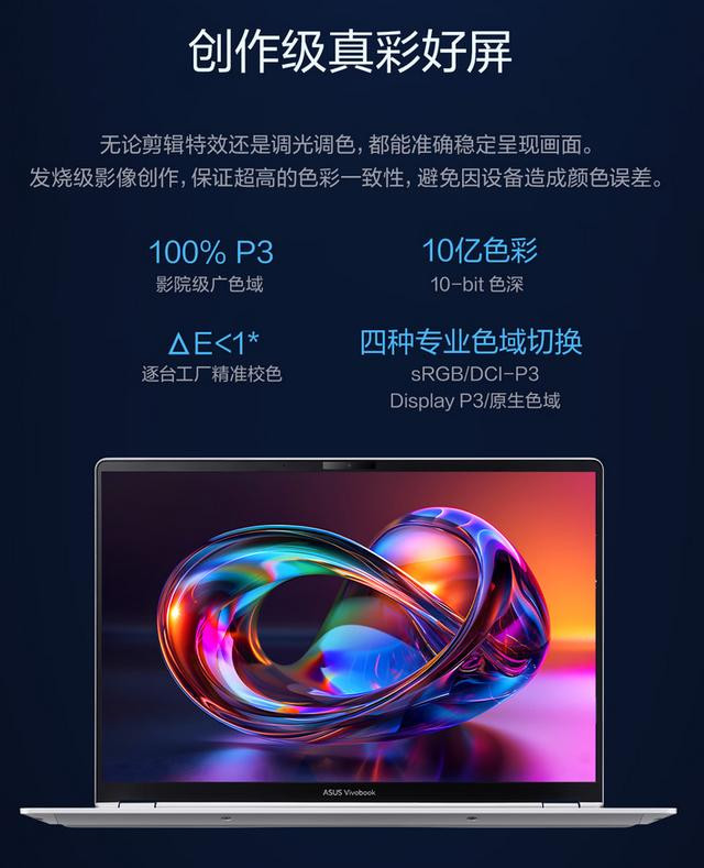 华硕丧胆 Pro14 酷睿版 2026 的 14 英寸 OLED 屏幕雷同达到 2.8K 分辨率、120Hz 刷新率、1100 尼特峰值亮度、100% P3 色域和 ΔE