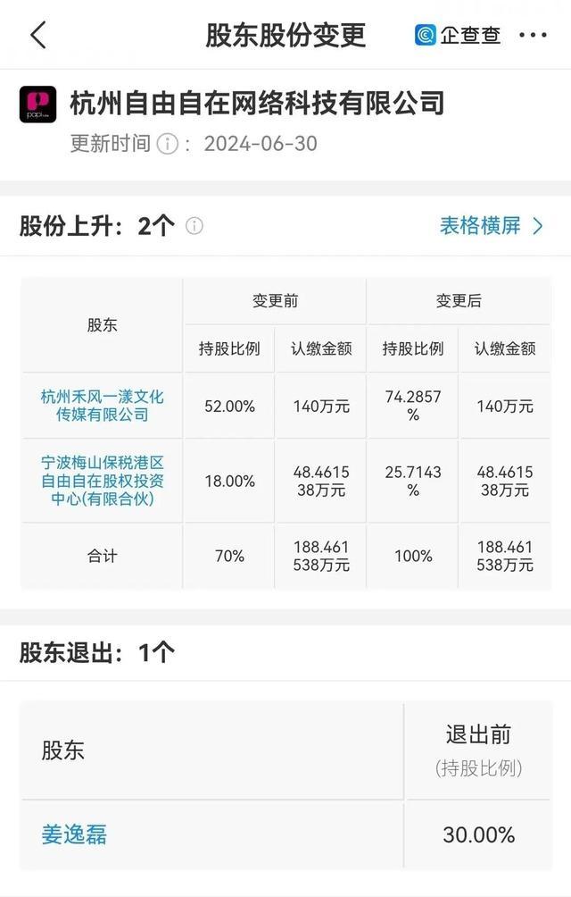 企查查APP泄漏,2024年5月,姜逸磊领先卸任papitube运营主体北京春雨听雷汇聚科技有限公司董事职务,退出一起惩办岗亭。同庚6月底,其又退出papitube母公司杭州摆脱安宁汇聚科技有限公司鞭策行列,退出前合手股30%,至此完成股权与惩办层面的全面解绑。当今,papitube由其结伴东谈主杨铭主导运营。